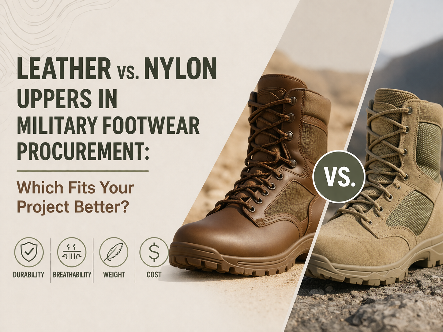 Leather and nylon uppers serve different purposes in military footwear procurement. Leather is often selected for structure, abrasion resistance, and a more robust appearance, while nylon is often chosen for lighter weight, improved breathability, and mobility. The right decision depends on the environment, duty pattern, support requirements, maintenance expectations, and overall project goals.